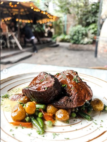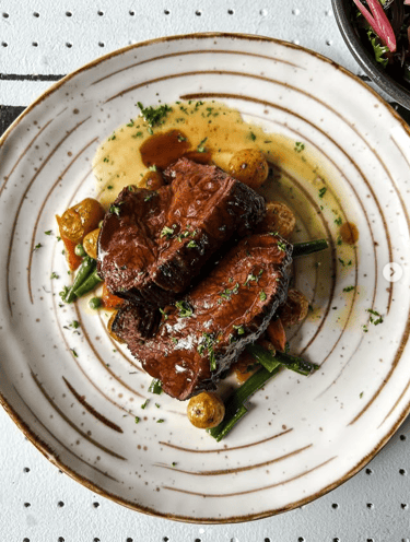 LOMO: Corte de res con vegetales salteados, salsa gravy y hojas verdes.