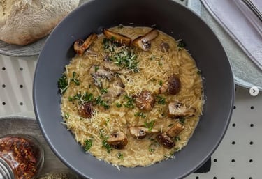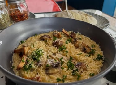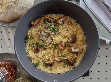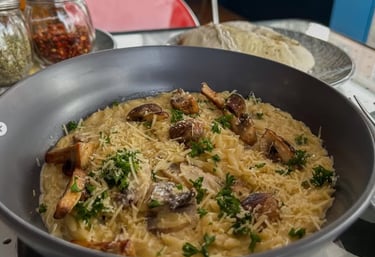 ORZO: Pasta Orzo con crema de setas, aceite de ajo y champiñones dorados